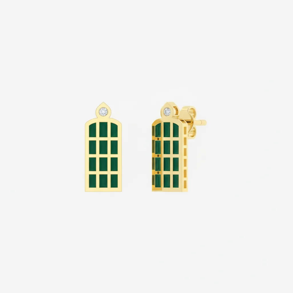 Zelený enamel vložený do zlatej mriežky vytvára pôsobivý kontrast, ktorý zvýrazňuje hĺbku dizajnu, zatiaľ čo jemný zirkón v hornej časti dodáva náušniciam iskru elegancie.